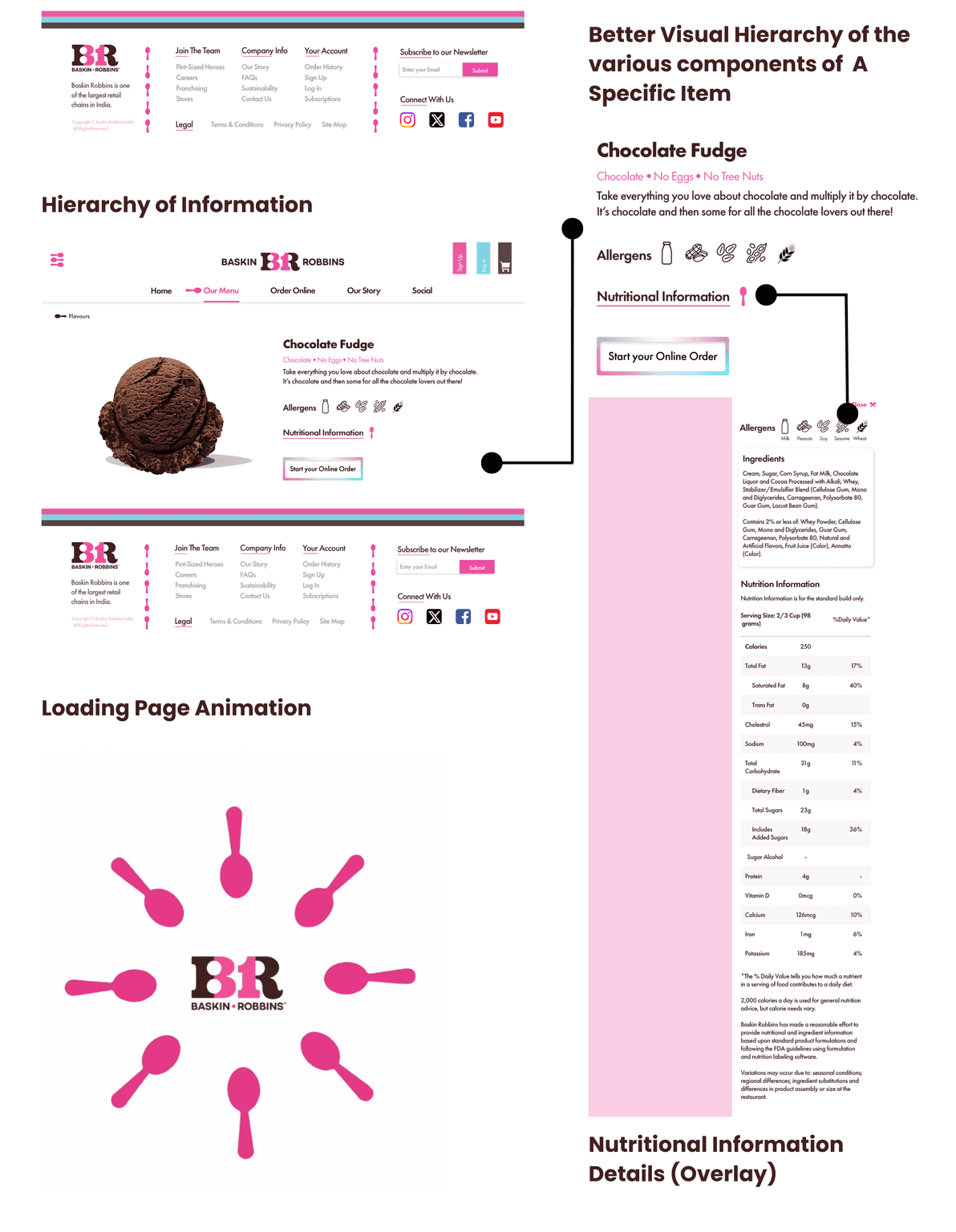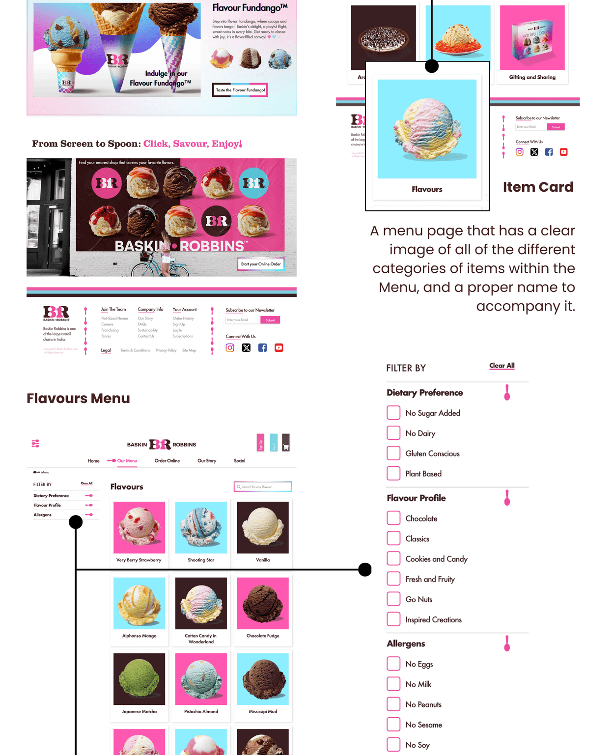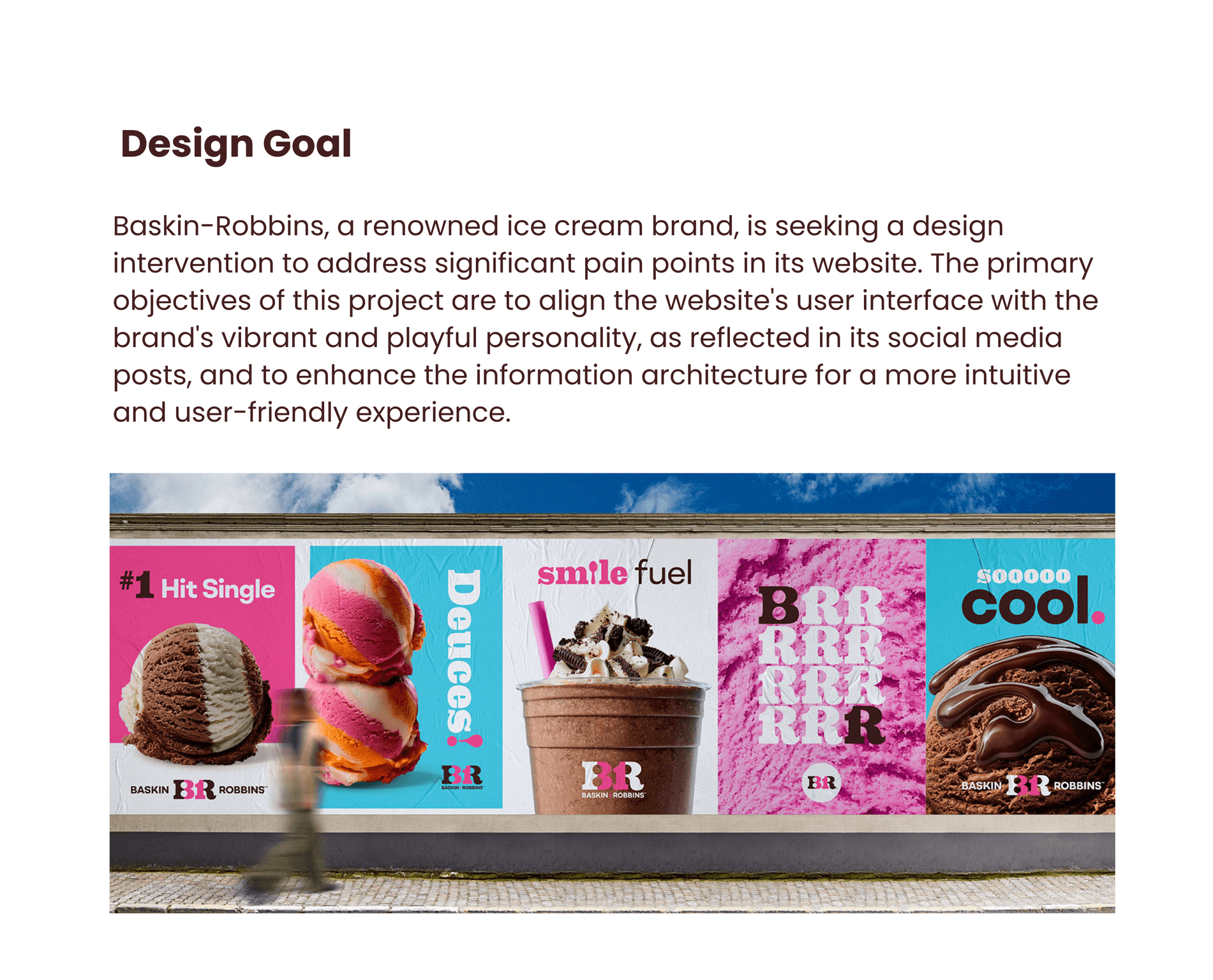 After evaluating the Baskin-Robbins India website, I found it lacked the brand’s vibrant, fun personality, and its information architecture was ineffective. I redesigned the site with bold visuals, interactive elements, and a more intuitive structure to create a seamless, engaging experience that reflects the joy of visiting a Baskin-Robbins store.