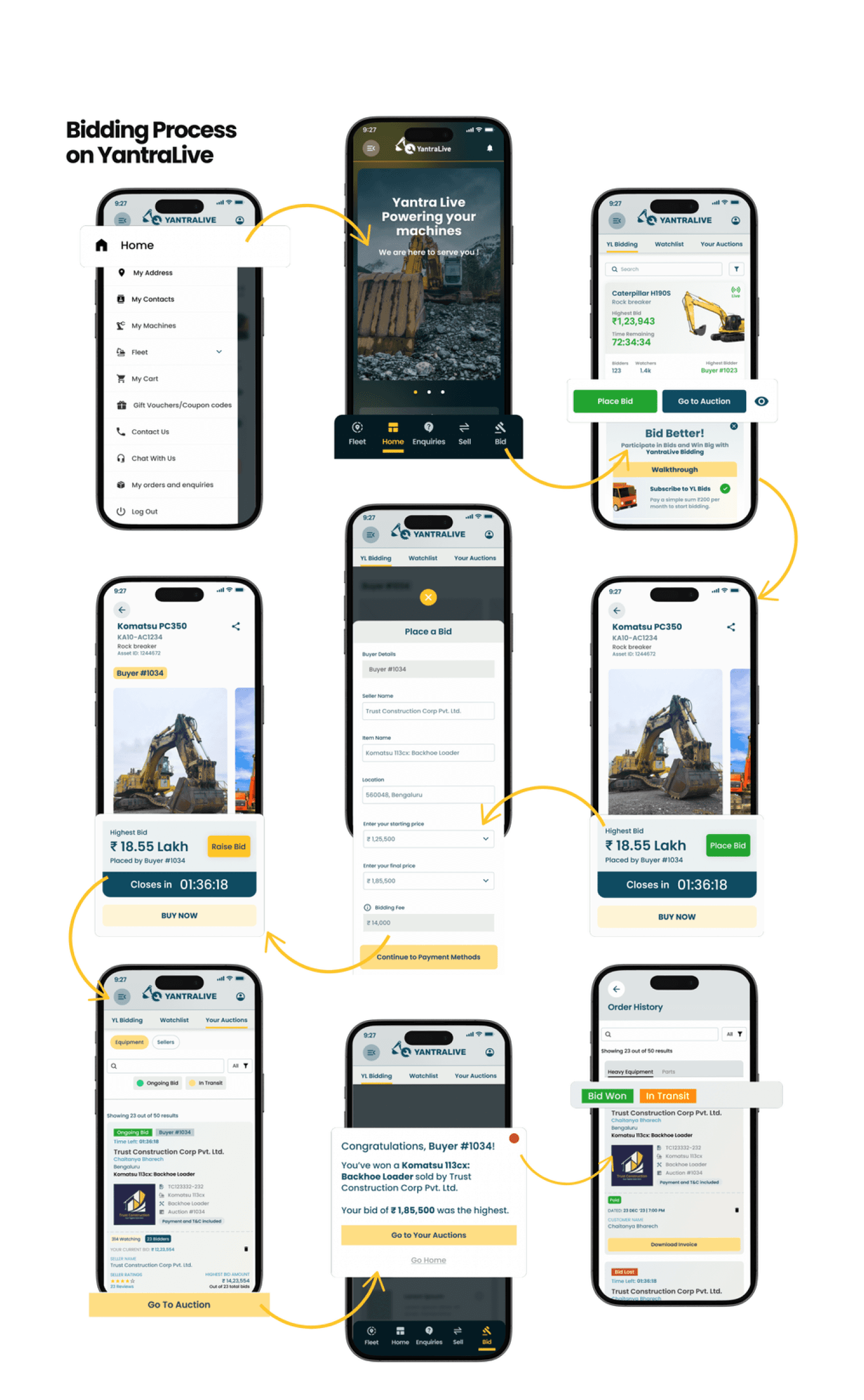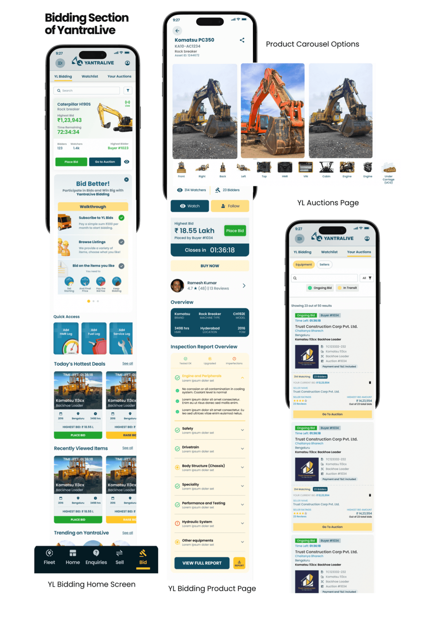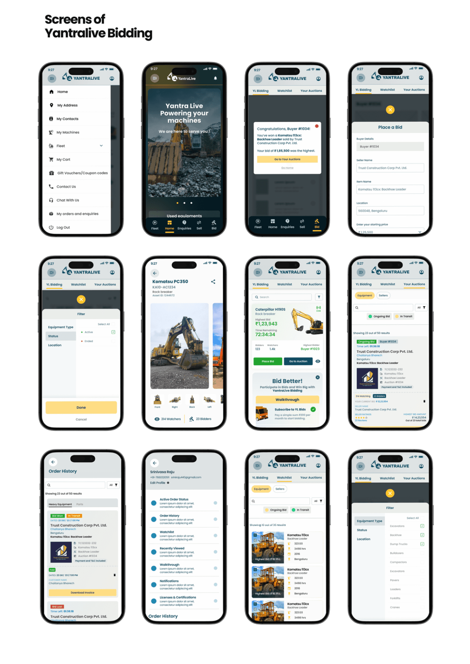 I designed the heavy equipment bidding section for Yantralive, focusing on creating a seamless and efficient user experience. The design simplifies the bidding process, allowing users to easily place, track, and manage bids on heavy equipment, while ensuring smooth navigation and functionality throughout the platform.